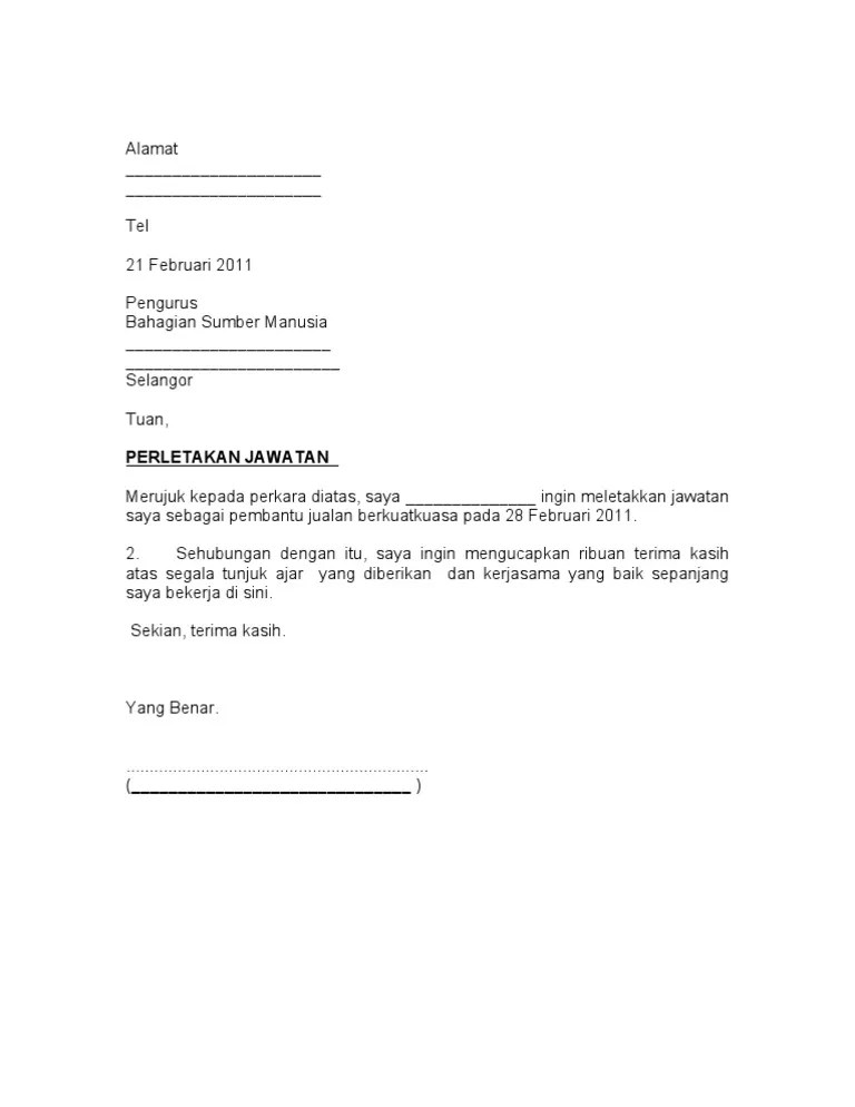Kalau tak nak kerja dalam pejabat, maka kena kerja sendiri, buka perniagaan/syarikat sendiri, tetapi pengetahuan tentang ilmu … 79% 79% found this document useful, mark this document as useful. Contoh surat perletakan jawatan (notis sebulan) berikut ialah contoh surat berhenti kerja kerana telah mendapat tawaran di tempat lain, dengan notis sebulan atau 30 hari. Sebenarnya tiada kerja yang mudah/senang … semua kerja dibidang profesional seperti doktor, kejuruteraan, akauntan, peguam. Save save contoh surat berhenti kerja notis sebulan for later. Dinasihatkan agar semak semula surat tawaran kerja terlebih dahulu, adakah notis sebulan dibenarkan.